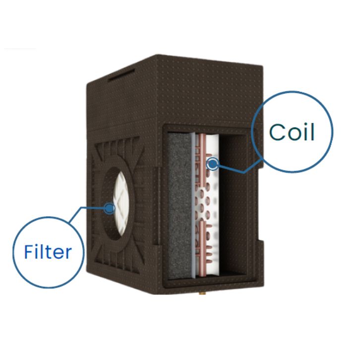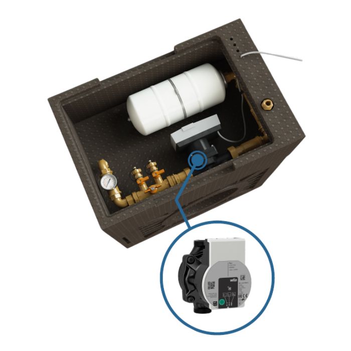Unitatea include schimbător de căldură, pompă de circulație (clasa A – la anumite modele), vas de expansiune, grup de umplere, senzor NTC și filtru G4, toate integrate într-o carcasă izolată din EPP fără punți termice. Activarea se face printr-un controller de temperatură (neinclus).